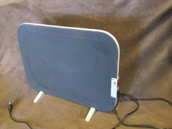 MiniPanel SP-160 radiant heater. Safe, with no hot surfaces. No fan so no noise. Free-standing. Works well under a desk for cold legs. Could be used to keep a litter of puppies or kittens warm in a cool place. 150 watts. Very good used condition. Has a lighted on-off switch. Does work. 20 inches wide; 15 inches tall. Retail price is $89.