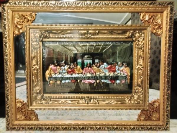 This depiction of the famous last supper with Jesus and the apostles is a relief style, for a 3D effect, painted in vibrant colors, with a mirror border, and floral accents around the frame.