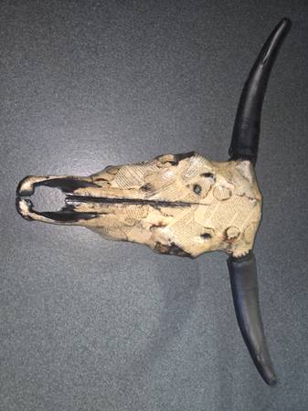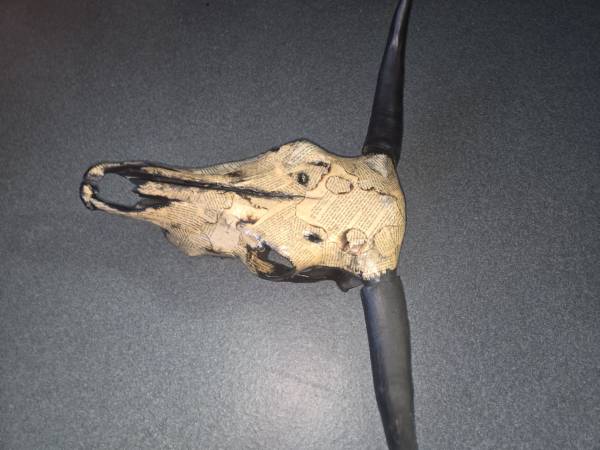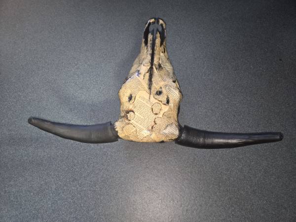 Add a bold Western touch to your space with this decorative longhorn skull. The piece features wide, dark curved horns and a skull surface artistically covered in vintage-style text print for a rustic, one-of-a-kind look. Perfect for a farmhouse, lodge, office, or living area.