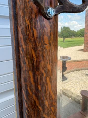 Beautiful, original hall tree: Beveled mirror, wood grain with banded trim, storage under seat, hangers.