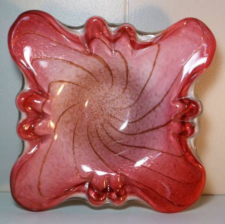 2 1/2''T X 8 7/8''L X 8 1/2''W- Fratelli Toso Murano Art Glass Butterfly Ashtray Pink & White Cased w/Gold Aventurine Ca. 1950's Mid Century Art Glass Tobacciana. Excellent condition with minor scratches and wear and a tiny flake on one of the ridges on which you rest your cigarette. 150.00 OBO. CALL OR EMAIL-TEXTS WILL NOT BE ANSWERED-PICK UP ONLY-CASH ONLY.