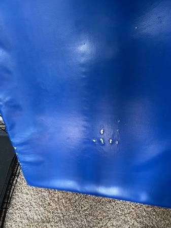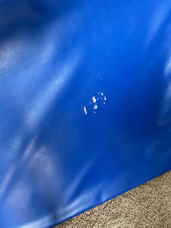 Size is large. Fits 4’ x 30” very tuff material. Has a few scuff areas but not ripped through mat.