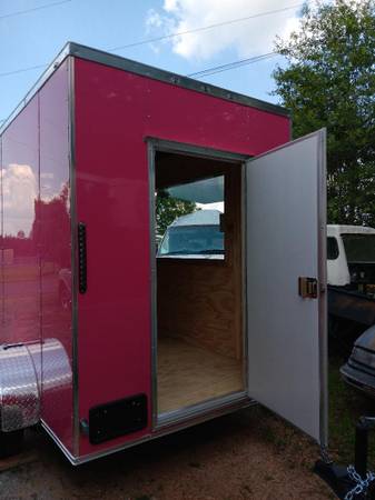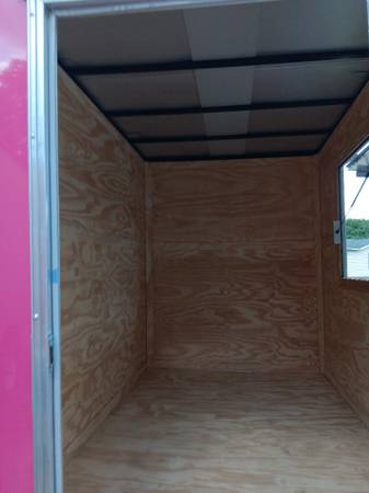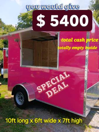 concession food trailer / vending trailer--yep its brand new special ordered empty and the price is only $5400 total cash price out the door no extras--its PINK and the size is 10ft long x 6ft wide x 7ft high yep 7ft high in case you want to add a hood exhaust--has a flat front instead of v nose that way you have more usable tongue space for propane gas tanks or generator--and not only that its easier to finish inside--has rear rv entrance door by doing this you have more usable wall space--big vending window 36" x 60" no screen no glass--remember this is an empty trailer meaning no sinks no electric no equipment--have title--you want to get into the food business--you want a new trailer with vending window well come check out this little beauty get inside and see if its what you need--no financing--no rent to own--no trades unless its cash.
