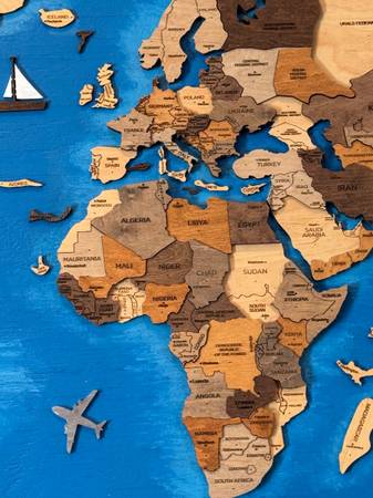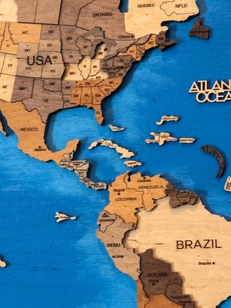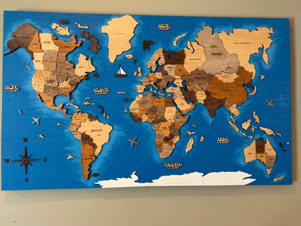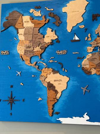 Wooden world map on painted background. Measuring 5’ x 3’ . Very heavy and you can add pins