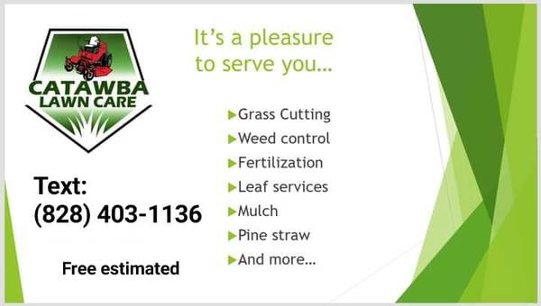 Thank you for considering this advertisement. We would like to share our services here when you require assistance. We offer the highest quality lawn services in all cities within Catawba County, including Hickory, Conover, Newton, Claremont, Maiden, Mountain View, Long View, Catawba, Sherrills Ford, Lake Norman, and more. Our services range from grass cutting, weed control, fertilization, leaf removal, mulch, pine straw, aeration and much more. Please text us for a free estimate at (828) 403-1136. It would be a pleasure to conduct business with you and thanks for your preference. God bless you.