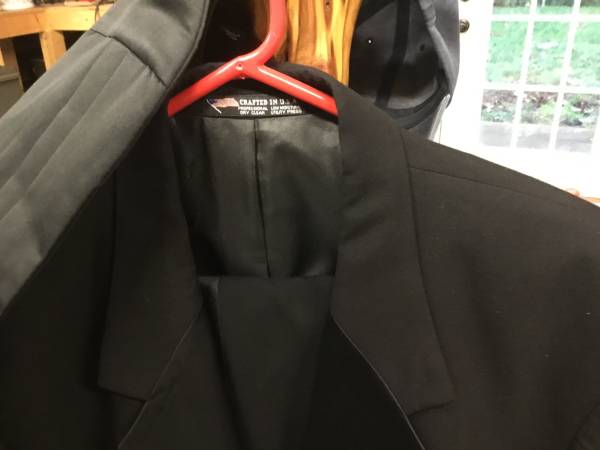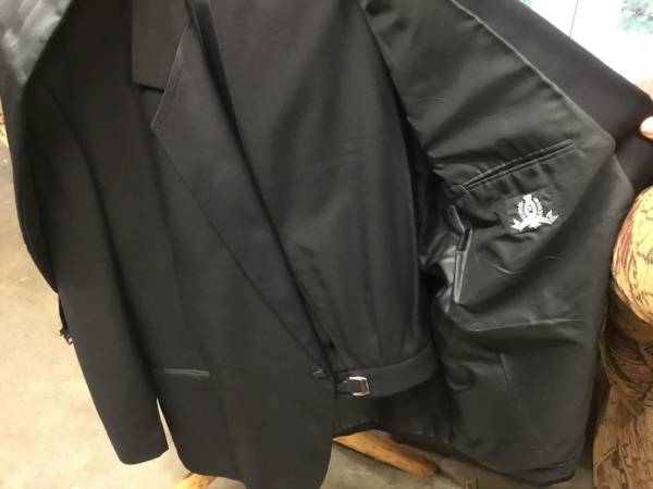 This is a men’s tuxedo in beautiful condition. I wear a 46L with pant size 40/32. This jacket fits in the chest but is short in the arms, therefore I’m assuming it is a 46R. The pants fit perfectly but can be adjusted up or down at least 1 size. There is room to alter the length of the arms and pants, but since I already has 2 tuxedo’s I’m just trying to get the $100 I paid for this at a second hand store as opposed to spending more on alterations. It is Made in America and in great shape. It comes with a black cummerbund but no tie.