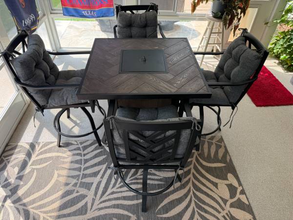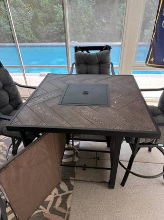 Bar height table with propane lava rock fire pit and 4 chairs. Everything works, does not come with propane tank. $500 obo. CASH or PAYPAL only. MUST PICK UP, NO DELIVERY.