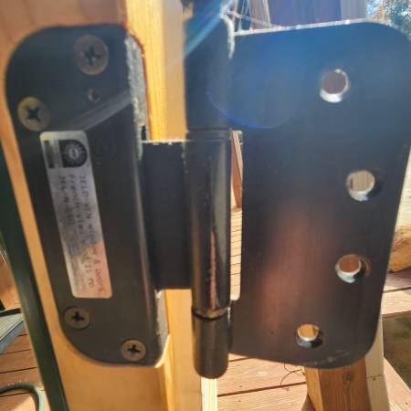 2 panel double french doors with full lite clear glass, natural wood interior with green metal exterior, left hand in swing with 2 lockset bore holes. Adjustable hinges included. 77-1/8"H x 34-1/2"W x 1-3/4"D. Frame, threshold and lockset NOT included. In excellent working condition