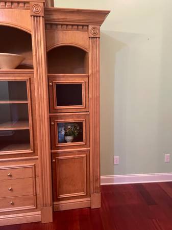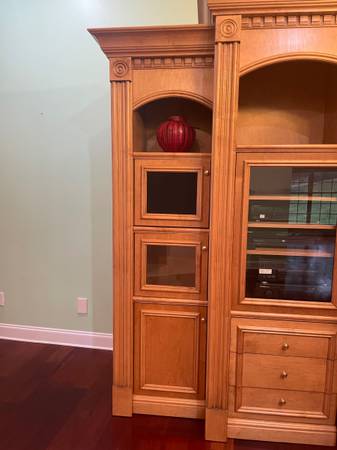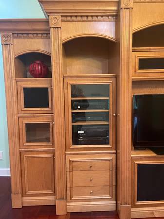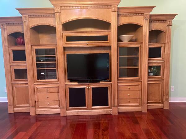 Mahogany or Maple Entertainment Center, not sure of wood; 5 separate pieces , has doors, drawers, open shelves and covered shelves. You would need at least a 10 foot ceiling at peak of cabinets at center point; I think space for TV is 40 inches, not sure? Beautiful units with crown molding. Side units are just over 6 ft. Tall. Total width is 14’ 5”. You will need two people to take apart and move carefully so as to not damage units or hardwood floors in current owners house. Located near Granada Farms Golf Course.