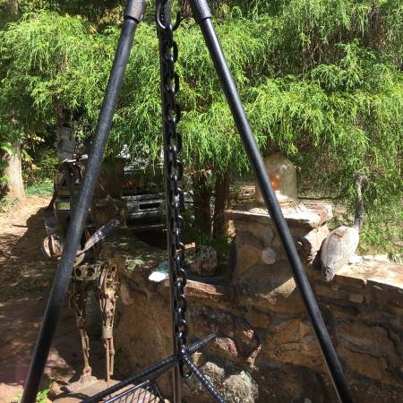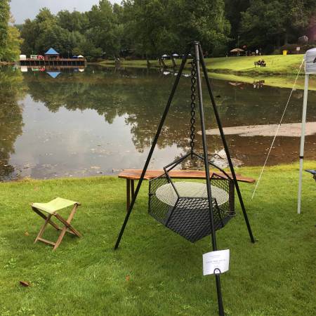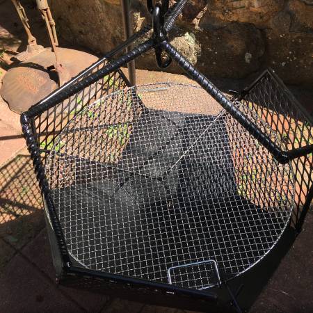 This fire pit/grill is 6’ tall, with a footprint of approximately 4’ .The basket is approximately 30” and is made of expanded metal on the sides and 1/8” steel on the bottom. The grill top is 24” stainless steel.
