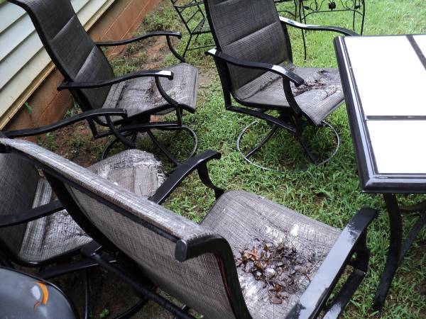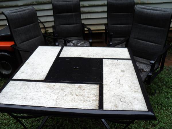 if the listing is on, these are still for sale. Have this metal outdoor table with four chairs, the chairs need pillows or recovered, the table is dirty. will need cleaning. you can put an umbrella in the center of the table if you like. if you are interested, please email me your phone number so i can call you. Thanks.