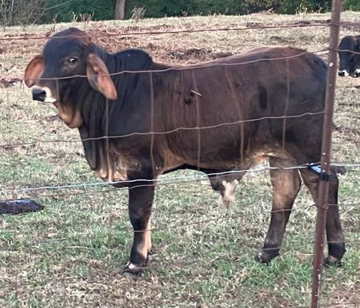 5 month old Brahman bull calf for sale. Dog gentle, will let you rub and pet all over him. Grain fed daily. His sire and dam are pictured. Call or Text for more information