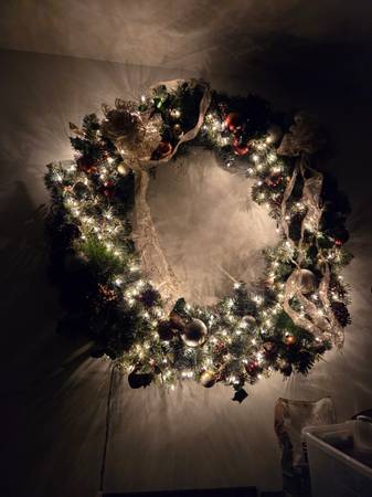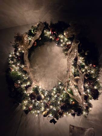 5' lighted and decorated Christmas wreath for outside. Excellent condition, garage kept. This wreath is a bit heavy, probably 40-45 pounds. Looks fantastic, just getting too old to climb that ladder...