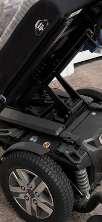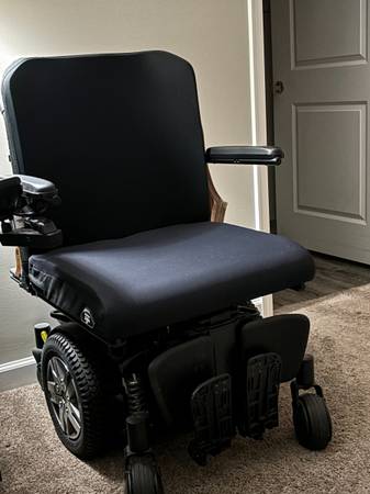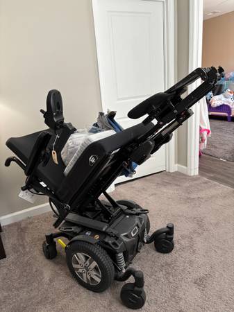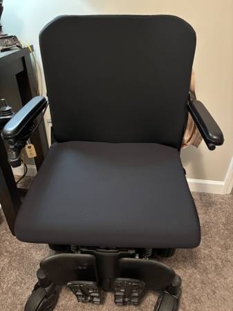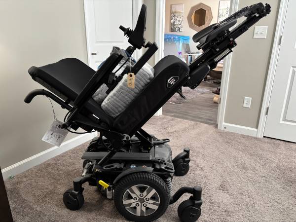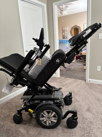NEW, never used, never been outside of apartment (wheels have no dirt, it's been sitting on carpet since I got it 6 months ago). Cost over $4500. It is a bariatric size (wide) and will hold over 500 pounds. It's too large to use in my small apartment. It has 4 speeds, It raises and reclines, has headrest, footrest, charger. See the pictures.