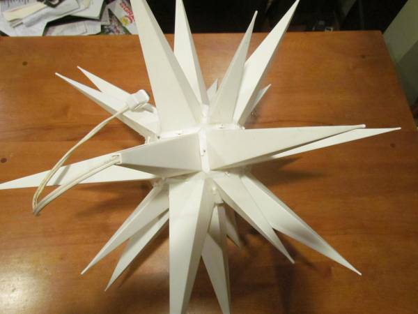 This is an already-assembled Moravian star, approximately 21 inches across. It comes with a 60-watt equivalent LED bulb (Value $6), so it is unlikely you will ever need to replace it. The kit for this size is $70, and you would need 2-3 hours of meticulous, frustrating work to assemble it. I have reinforced several vulnerable joints with hot glue. The photo of the lighted star hanging is mine, not this one, but they are similar. It is best to hang this under an eave, out of the rain and snow. It comes with an extra cord with socket (shown) and about 10 extra clips.