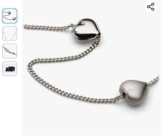 A link chain pierces the core of these happy hearts as they circle the throat like content lovers--without dangling or excessive twisting. The alternating flat and polished finishes are a clear complexion and a blush making the chain eternally youthful. The delicate size and flirty accents make this necklace a perfect romantic gift for those who believe love makes a heart feel young. The necklace is 17 inches long, made of durable 14k white gold, and fastens with a lobster claw clasp.