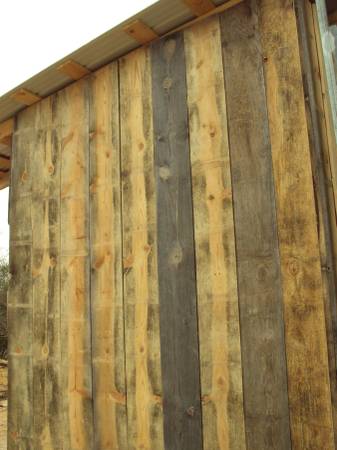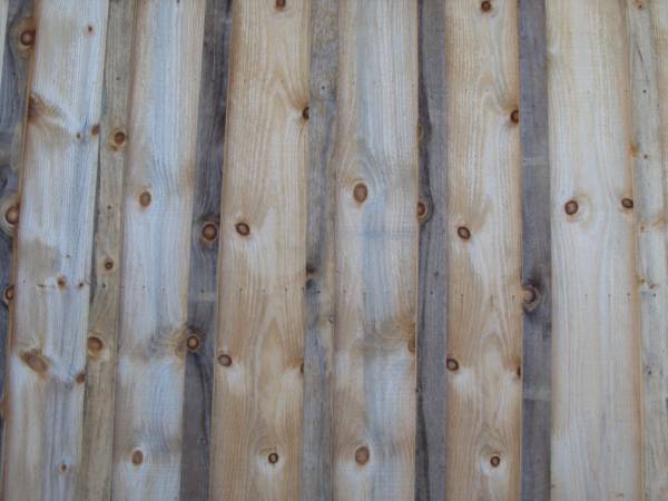 The first picture is of new pine and the second picture is of the same wall after one summer of being exposed to the sun and weather with no treatment. Material for sale is new.