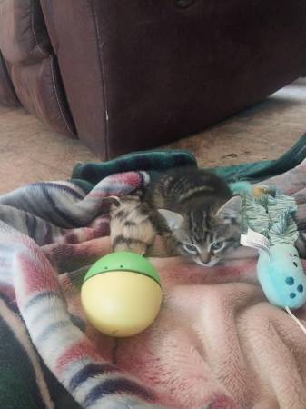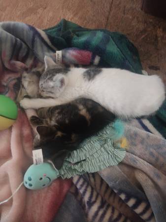 Two 6 week old kittens .They must stay together was found together and inseparable. They are sweet,wormed,liter trained,and eating on their own.Both are girls,.been around children and other cats.Maggie and Maybelline must go to good home.Aslo come with collar and food bowels.