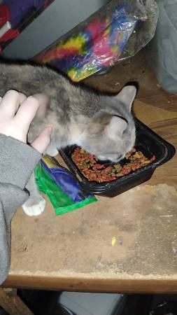 Hi there! We are currently trying to rehome a kitten that one of our strays brought here. She's very sweet, although a little scared of new people at first. We're not sure her exact age, but she's not over a year. She has not been fixed. Door pickup only. $10 rehoming fee applies. Please text if you're interested.
