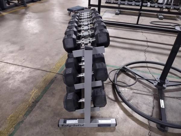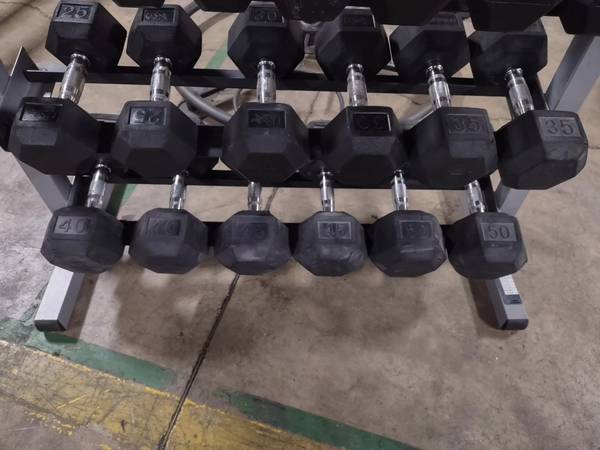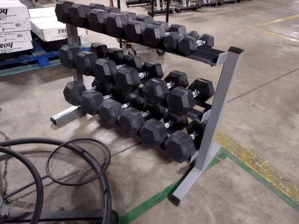 Great preowned dumbbell set available. This is a preowned 5lb - 50lb rubber hex dumbbell set plus dumbbell rack.