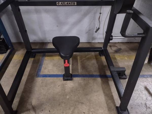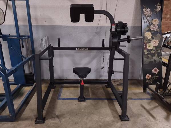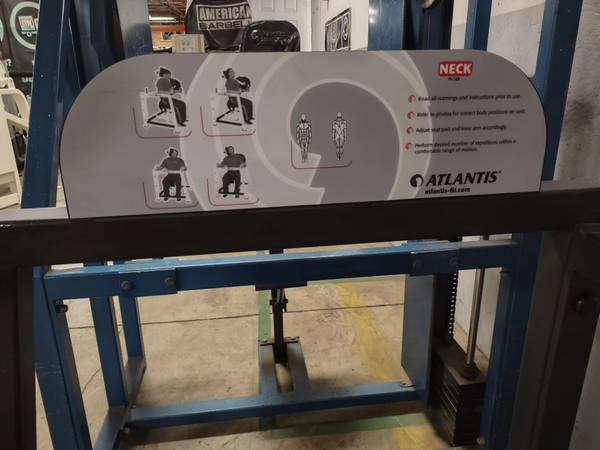 Great upper body piece of equipment designed by Atlantis available. This is a preowned neck machine. The machine is plate loaded. Take your neck workout to the next level with this machine today!