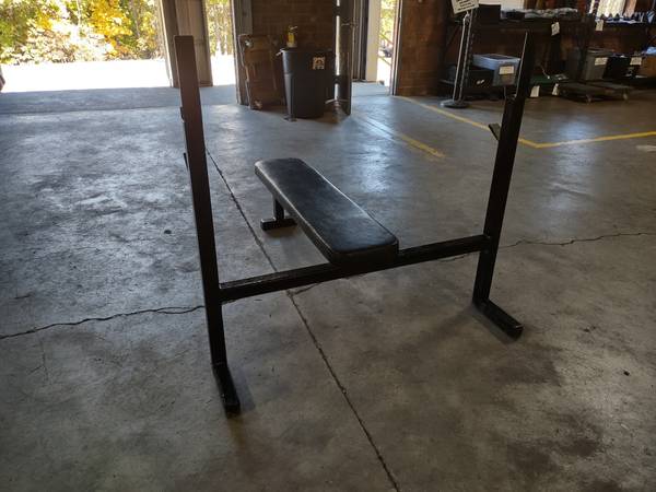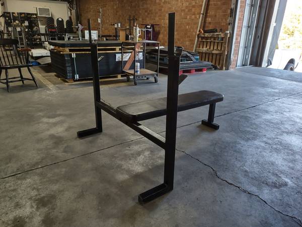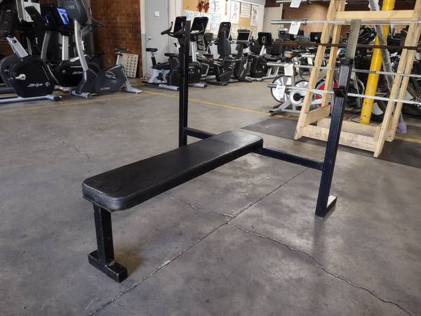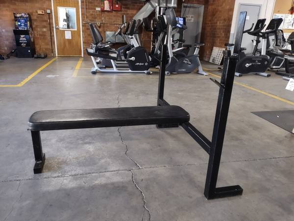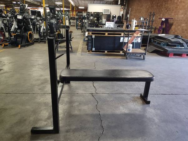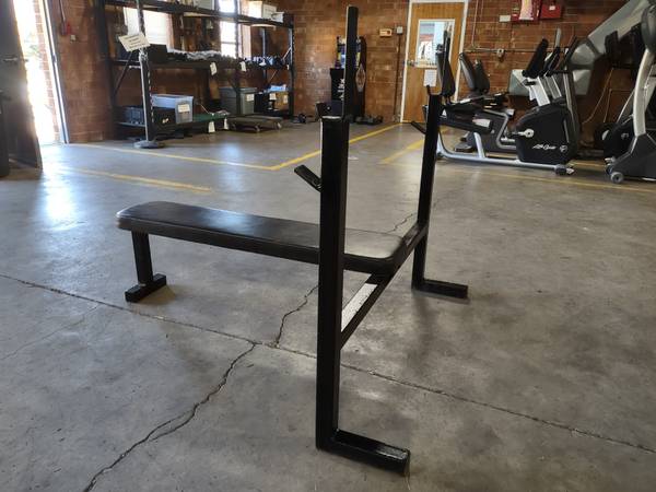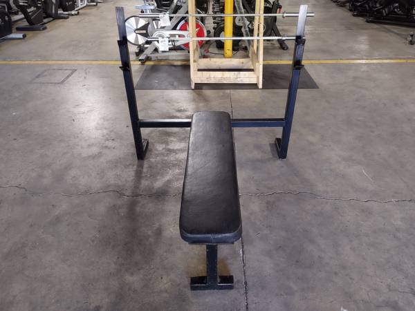 Great bench available. This is a preowned Olympic flat bench. Take your chest workout to the next level with this bench today!