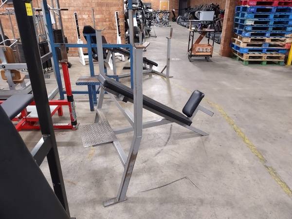 Great preowned bench available. This is a preowned grey olympic incline bench. Take your workout to the next level with this bench today.