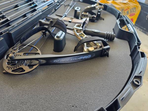 Left hand draw compound bow Comes with hardcase and target arrows and arrow stand, as well as an unused target block. Release also included.