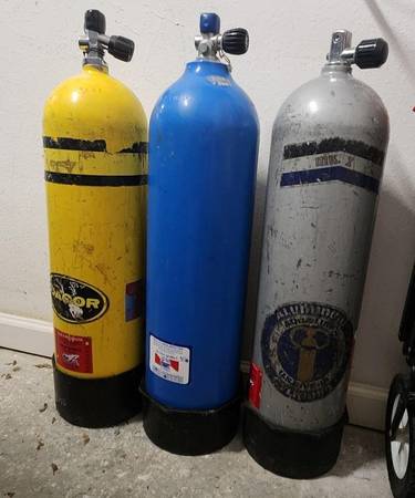 3 Scuba tanks for $60 or $25 each. All have air in them and may not be able to be hydroed. All 3 have boots. 2 have valve covers. Use to inflate tires in remote locations, use to power air tools and...