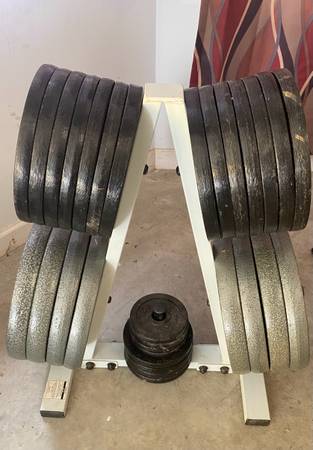 380#'s, 1” plates; .50$ a pound. (2), 1" barbells; 8' and 6' long with (1) pair of clips; 20$/15$ (2) 25# dumbbells; 25$ York 2” Olympic EZ curl barbell; 100$ Good for small spaces and/or accessory...