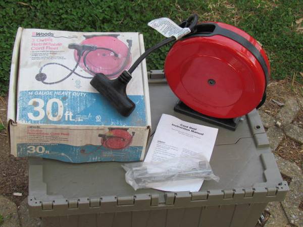 BRAND NEW Woods No. 48006 retractable cord reel, 14 AWG, 30-foot cord, with triple tap. The housing is metal, not plastic. Can be mounted on ceiling or swivel wall mount. Hardware included. Box is storage-worn, but the item is in new condition. Comparable items are in the $100 range.